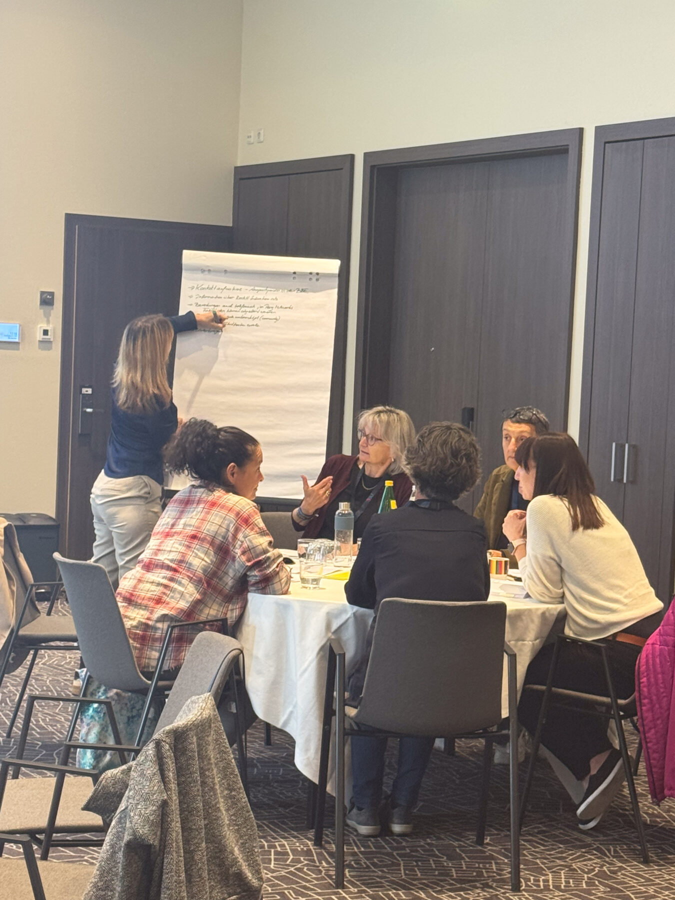 Nach einer Vorstellrunde der Organisationen fand ein World Café statt – auf vier Tischen haben sich die Teilnehmenden über verschiedene Problematiken zum Thema Gewaltschutz unterhalten – welche Möglichkeiten gibt es, wohin kann ich Klient*innen verweisen, welche Herausforderungen gibt es, wo liegen die Grenzen, usw.