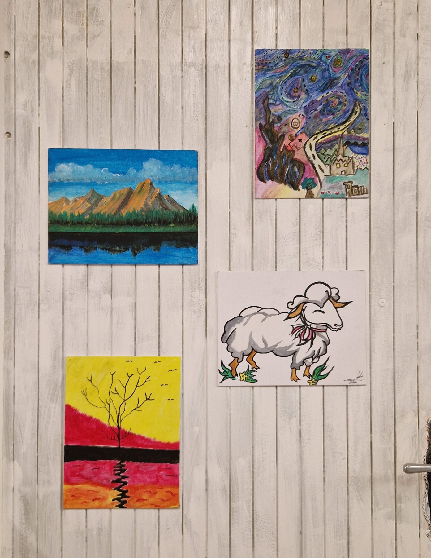 Einige Werke sind während mehrerer Workshops in der Betreuungseinrichtung entstanden. Wie etwas jenes einer Frau, die ihre Flucht künstlerisch aufarbeitet. Das übergreifende Thema der Ausstellung, Tiere und Natur, spiegelt sich in den meisten anderen Gemälden wieder. Auch Kinder haben fantasievollen, lebendige und herzliche Interpretationen beigesteuert.