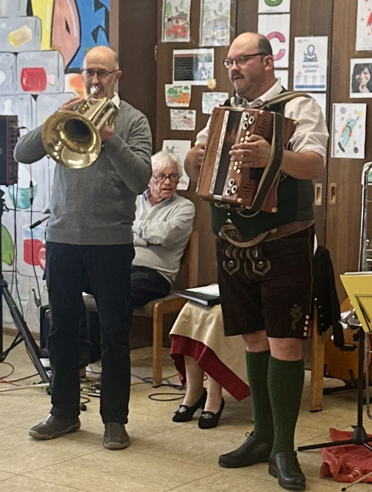 In original Kärntner Lederhosn spielte Patric mit Bandkollegen, dem Konzert-Initiator Roland G. in der Betreuungseinrichtung Finkenstein auf. Roland ist jeden Dienstag in der Betreuungseinrichtung und spielt mit den Klient*innen Disc Golf – und alle sind mit Freude und Einsatz dabei. „Mir ist aufgefallen, dass die Leute davor und danach Musik am Handy anhören. Und da habe ich mir gedacht, ich könnte mit meiner Band ein Konzert geben, wo wir unsere Lieder spielen und die Klient*innen ihre Musik vorstellen. Die Gabriela (Einrichtungsleiterin Gabriela N.) war sofort begeistert – und dann haben wir es organisiert.“